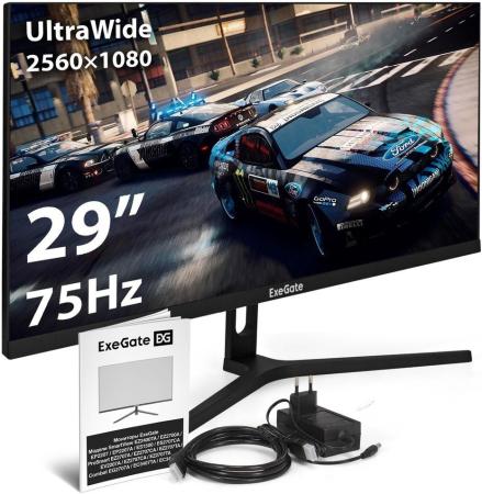 Монитор безрамочный с аудио 29" ExeGate SmartView ES1500 (IPS LED Grade A+, 2560x1080@75Гц, 21:9, 300cd/m2, 1000:1, 178°/178°, 1ms, HDMI, DisplayPort, USB, аудио-выход, RGB-подсветка, FreeSync, Flicker-free, Low Blue Light, кабель HDMI 1.5м, VESA, регулировка наклона экрана, черный)